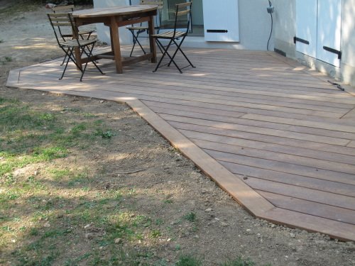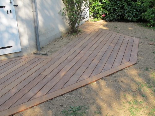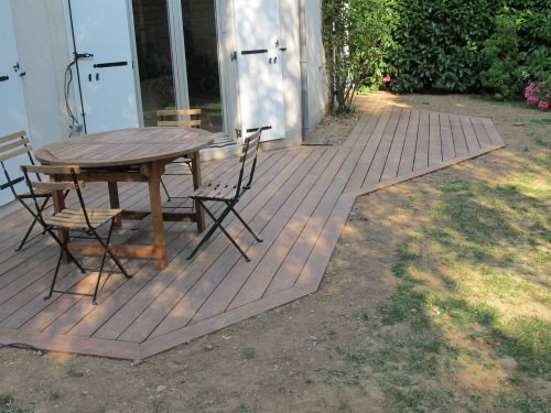 Terrasse en Cumaru à fleur du gazon, forme très irrégulière