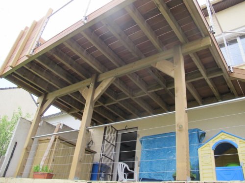 Impressionnante structure en hauteur avec madriers porteurs en porte-à-faux.