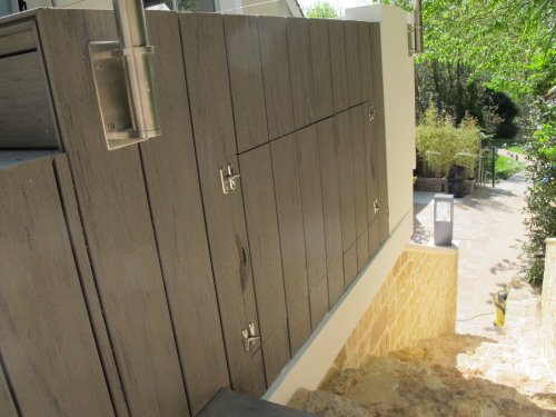 Habillage des côtés du jacuzzi et création d’une porte pour l’accès au bloc technique.
