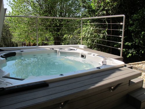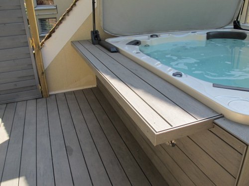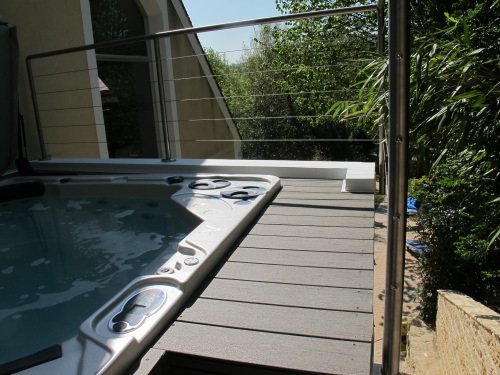 Terrasse en bois composite Timbertech Terrain autour d’un grand jacuzzi
