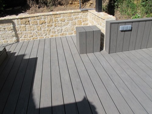 escalier en lames Timbertech Earthwood Terrain, construit sur une structure en lambourdes