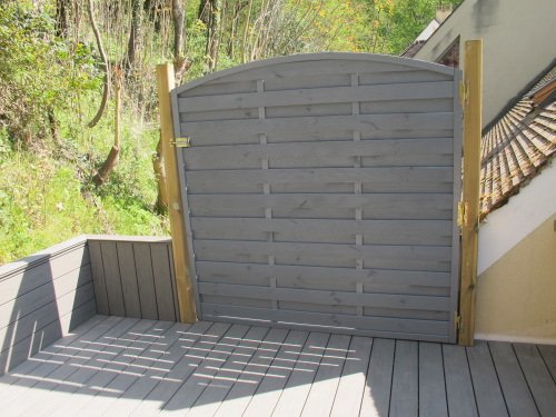 pose d’un claustra en guise de porte, peint en gris