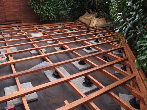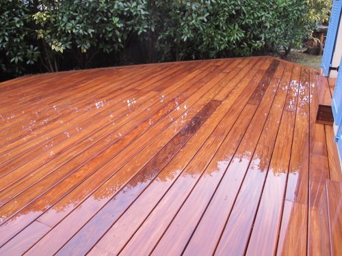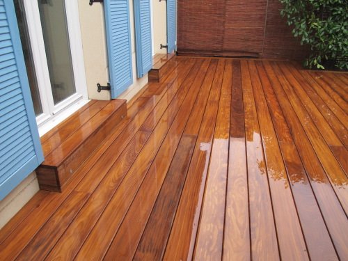 Bel aspect après la pluie. La terrasse en bois n’est pas du tout glissante.