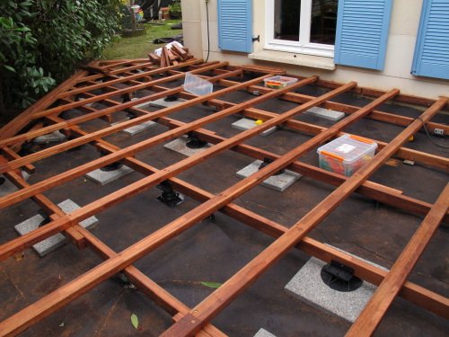 Il n’était pas possible de visser les vis de fondation dans le sol. Nous avons installé des plots PVC et des dalles béton, avec une double structure, bien entendu.