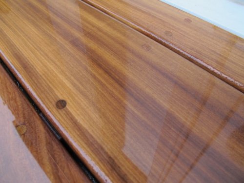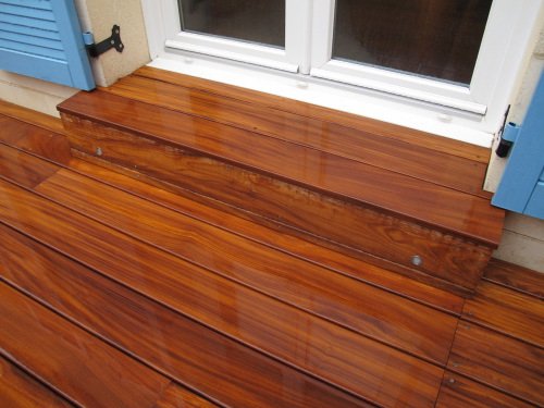 Habillage du seuil de la porte-fenêtre avec des lattes en Afrormosia.