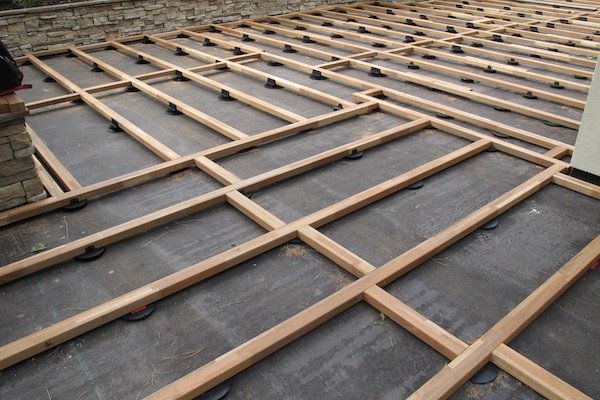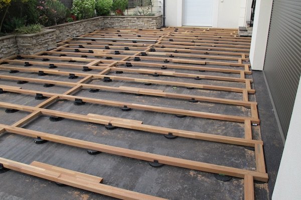 Nous avons donc utilisé nos plots réglables ultra-plats et mis en œuvre des entretoises entre les lambourdes pour renforcer la structure autant que possible.