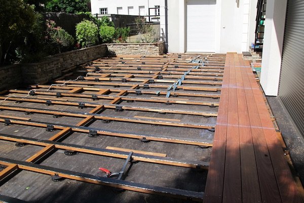 Pose des bandes bitume et des premières lignes de lames de cumaru.