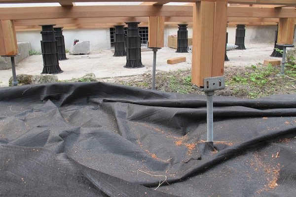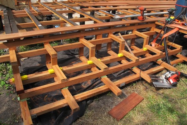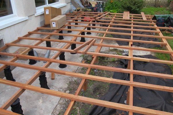 sur cette terrasse, nous avions un sol différent selon les zones. Nous avons donc mixé des vis de fondation, des plots de grande hauteur, des cales, selon la hauteur disponible sous les lambourdes. Mais le plus important est de créer une structure croisée avec les lambourdes, cohérente quelque soit le sol sous-jacent.