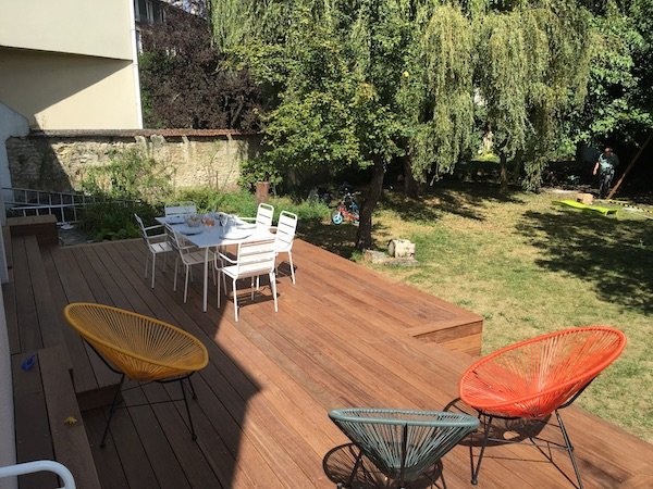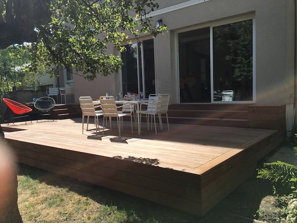 Terrasse en bois en cumaru à mi-hauteur avec un bel escalier, structure mixte