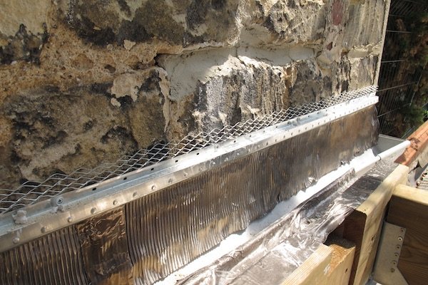 Nous avons donc fixé un solin spécial en plomb en pose traditionnelle (enduit à la chaux) pour assurer l’étanchéité entre le cheneau et le vieux mur.