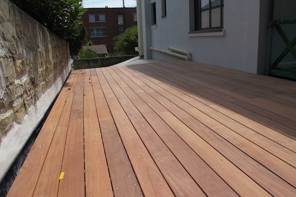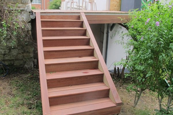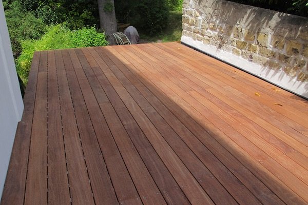 Terrasse étanche sur pilotis entre deux murs avec platelage en Cumaru
