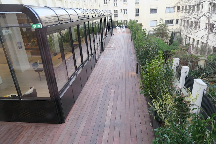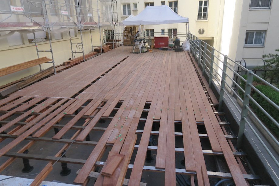 Au cœur de Paris, le centre d’affaires WeWork a été construit. Nous avons été chargé, par le contractant général, de réaliser plusieurs terrasse en bois exotique, Cumaru. La plus grande des terrasse a une surface de 300m2 et nous l’avons posé sur des plots réglables de grande hauteur. Auparavant, nous avons fiabilisé l’étanchéité bitume préexistante plutôt douteuse, en mettant en œuvre une membrane d’étanchéité EPDM sur la totalité de la surface. Ainsi, nous étions certains que l’étanchéité serait garantie à vie.