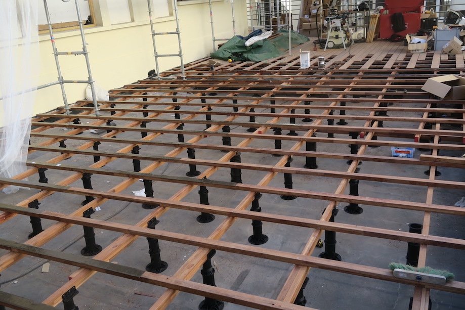 Voici la structure de la terrasse en bois constituée de lambourdes en bois exotique. Il s’agit d’une double structure (deux couches de lambourdes croisées, posées et fixées l’une au-dessus de l’autre et installées sur des plots réglables de grande hauteur). Sur les murs adjaçent, nous avons posé des muraillères pour fiabiliser l’ensemble. Le projet n’était pas simple, comme on peut le voir sur la gauche, des échaffaudages étaient présents : nous avons dû constament nous adapter à la situation.