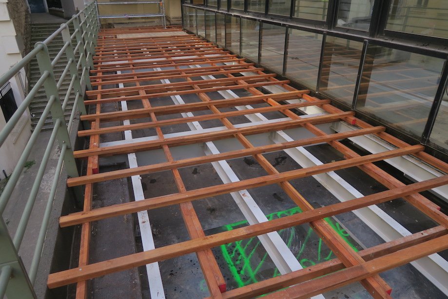 Il s’agit d’une autre partie de la terrasse complètement dégradée installée sur une structure métallique. Il nous a été demandé de démonter cette terrasse et de la remplacer par un ouvrage neuf. Nous avons installé notre structure en bois sur la structure métallique. Par la suite nous poserons les lames de terrasse en bois exotique sur cette structure.