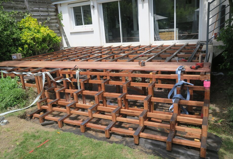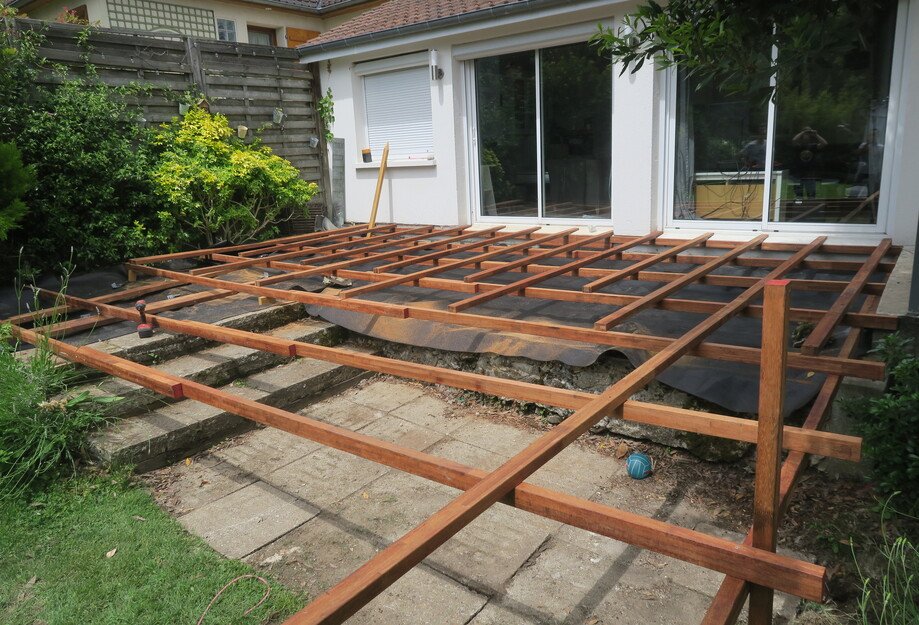 Sur cette photo, nous y voyons la structure et les lambourdes en bois de la terrasse. Le tout a été posé sur l’ancienne terrasse et l’ancien escalier de la maison.