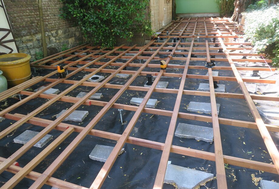 Sur cette photo nous voyons la structure porteuse avec les lambourdes en bois et le géotextile.