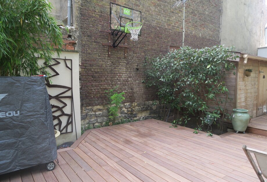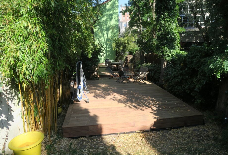 Nous avons réalisé une grande terrasse en bois exotique autour d’une extension de maison en bois. La terrasse est à 60 cm du sol et possède deux marches afin d’être au niveau du seuil de la porte. Nous avons intégré des spots d’éclairage autour de la terrasse en bois afin de parfaire son style de nuit. L’ensemble s’intègre très bien au jardin verdoyant de cette maison de ville.