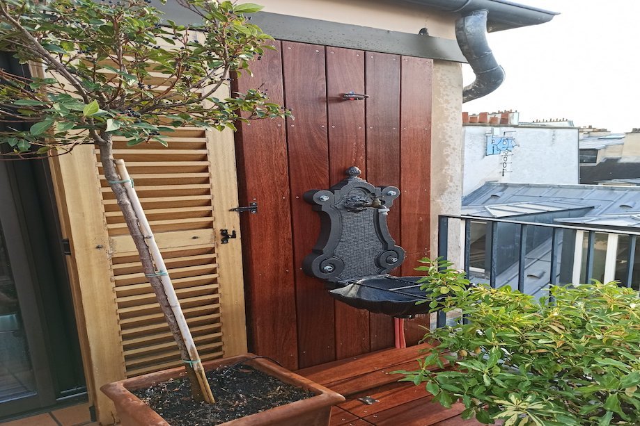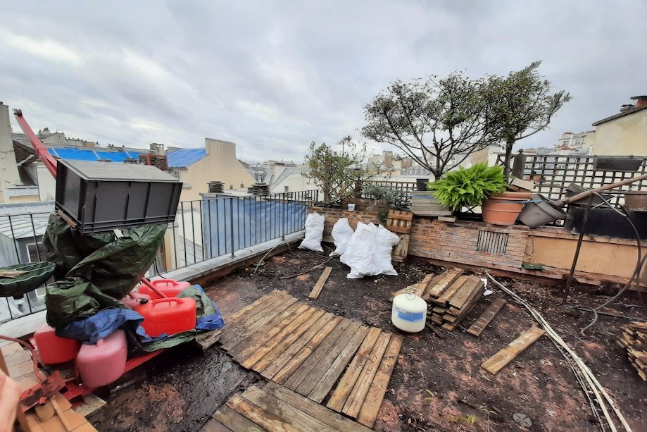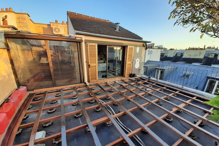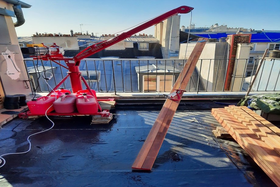 Nous avons installé une petite terrasse en bois exotique sur un toit en plein centre de Paris. L’accès à cette terrasse était très complexe (pas d’ascenseur, cour exiguë…), nous avons donc travaillé avec une grue de toit pour acheminer le matériel.