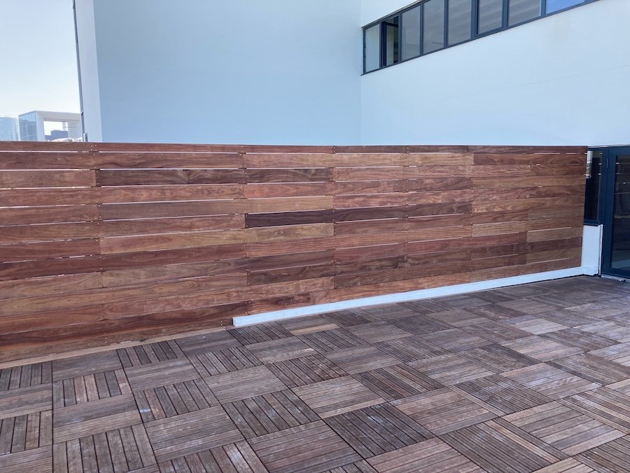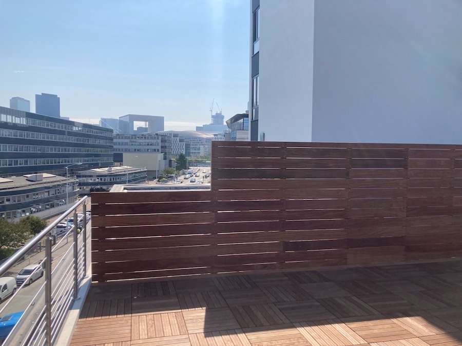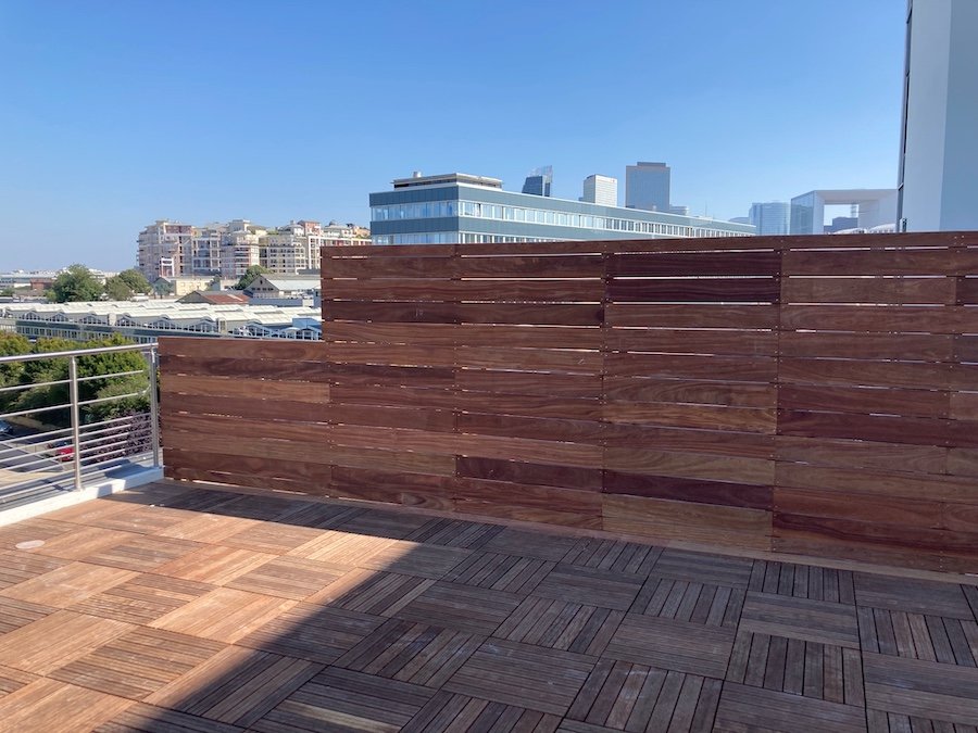 Ce sont des dalles pré-assemblées de 50×50 cm. Ces dalles sont en Ipé de très bonne qualité en vissage inox. Nous avons également créé un garde-corps en bois pour préserver la vue sur les espaces techniques du reste de la terrasse. Le garde-corps a été réalisé avec nos lames de terrasse en bois exotique (Cumaru).