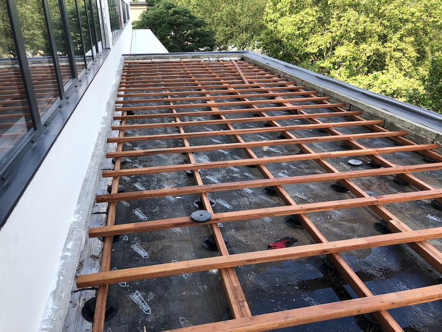 C’est pour cela que nous avons créé une double structure en bois exotique posée sur plots. C’est sur cette structure que nous avons installé nos caillebotis. Nous avons vissé quelques caillebotis, ce qui permet d’obtenir une très bonne stabilité et rigidité tout en permettant d’accéder aisément à l’étanchéité.