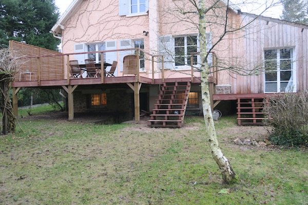 Pour la construction de cette grande terrasse en bois, notre client souhaitait conserver l’aspect rustique de sa maison et de son mobilier d’extérieur. En réponse à cette demande, nous avons réalisé une vaste terrasse principale, complétée par un escalier, un brise-vue, et un garde-corps en bois, afin de maintenir une esthétique cohérente avec l’ensemble de la propriété. Sous cette terrasse principale, nous avons également aménagé une terrasse secondaire, accessible par un autre escalier, offrant ainsi un espace supplémentaire pour profiter du jardin et des environs.