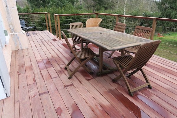 Sur cette photo, nous pouvons admirer la terrasse principale, la plus haute, réalisée en bois exotique de grande qualité, le Cumaru. Le garde-corps en bois, équipé de câbles en inox, offre une sécurité optimale tout en préservant l’esthétique de l’ensemble.