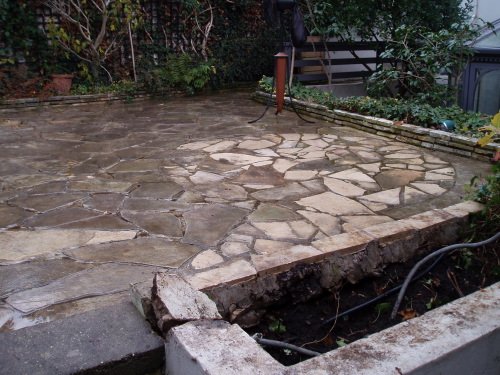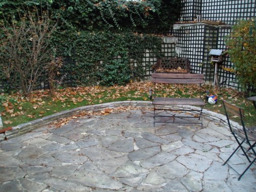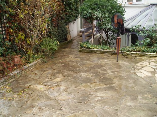 Il a été décidé de poser la terrasse au niveau du jardin. La pierre existante était par ailleurs très irrégulière et en forte pente.