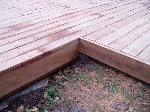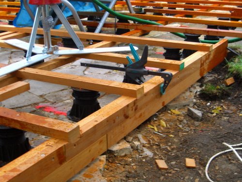 Pose d’une double lambourde sur la périphérie de la terrasse, qui supportera une lame de finition posée verticalement (pour cacher la structure de la terrasse bois)