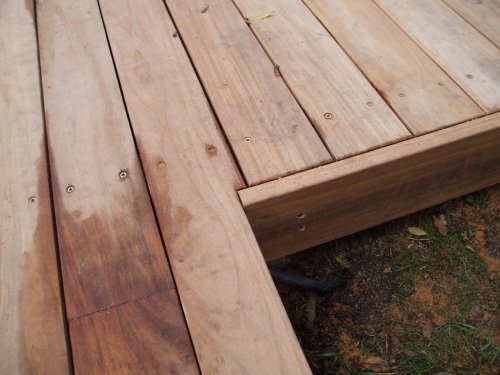 Terrasse bois en cours de séchage. Harmonie entre la terrasse bois et la véranda grise.