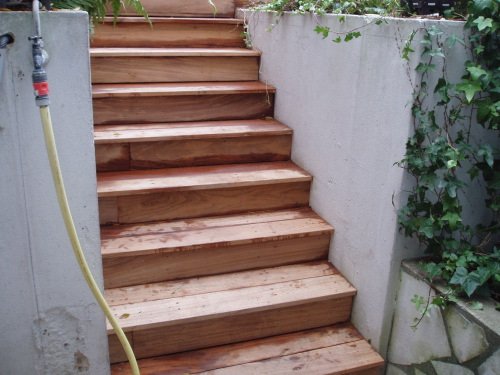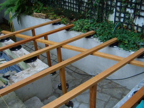 Il a été décidé de recouvrir un vieil escalier en béton et son inesthétique allée. Nous avons poursuivi la structure en lambourde au dessus de l’allée et posé des poteaux de soutènement (eux-mêmes fixés sur des plots réglables)
