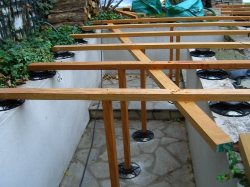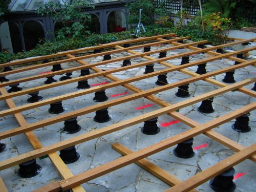 Nous avons donc mis en œuvre une structure de lambourdes posée sur des plots réglables. (gamme Megamart)