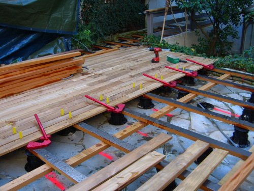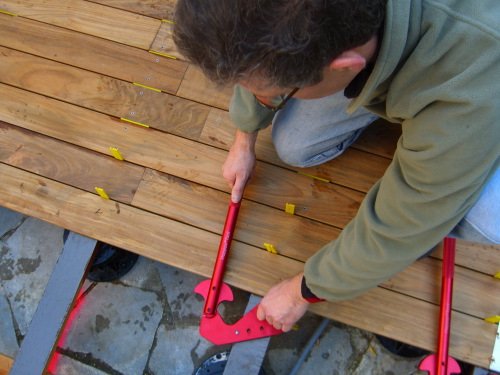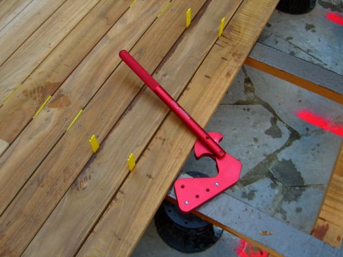 Nous avons collé les bandes bitumineuses sur les lambourdes, puis avons posé le platelage en Teck. Les cales jaunes permettent de régler l’espace de 4 mm entre les lames. Les outils rouges permettent de bien caler et serrer les lames avant leur vissage final.