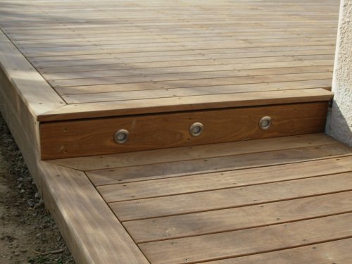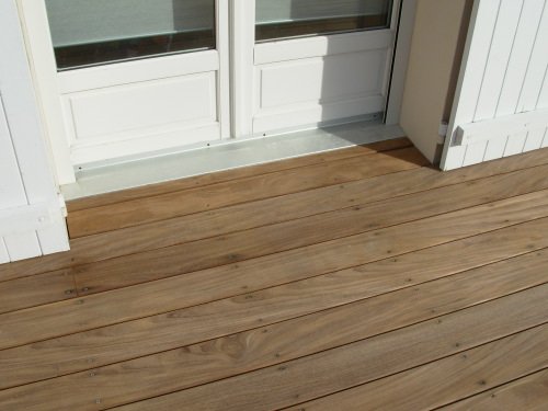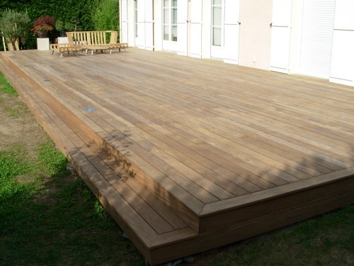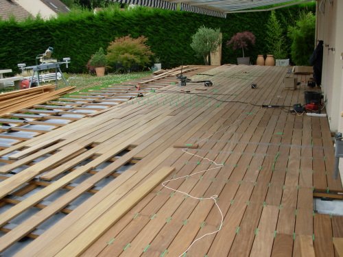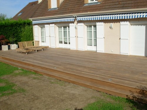 Le client venait de réaliser une grande terrasse en béton lissé teinté. Le résultat ne lui plaisait pas. Nous avons donc recouvert la terrasse béton d’un platelage bois, en Afrormorsia.