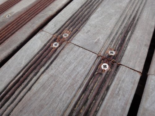 Et nous avons bien fait, car au démontage des clips de l’ancienne terrasse, TOUTES les vis ont cassé et sont restées dans les vieilles lambourdes. On n’aurait pas pu fixer les lames neuves sur des lambourdes truffées de vieilles vis cassées.