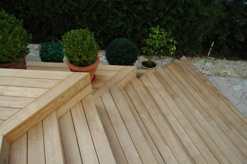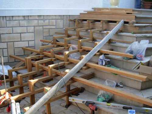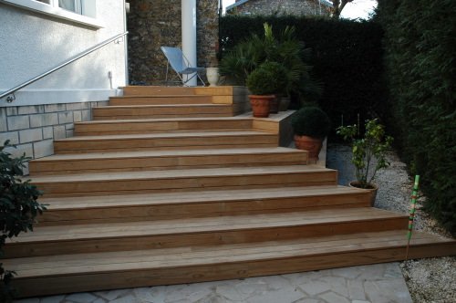 en bois exotique afin de rallonger les marches, créer 2 marches de plus afin de rendre l’escalier plus pratique.