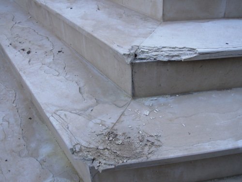 La belle pierre de l’escalier s’est complètement désagrégée sous l’effet du gel.