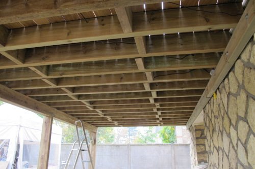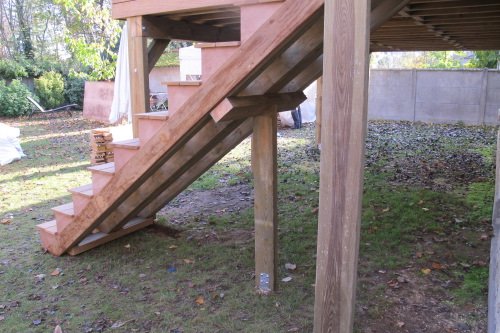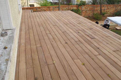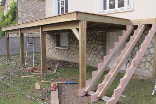 Vue d’ensemble de ce platelage en bois composite sur pilotis.