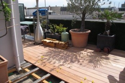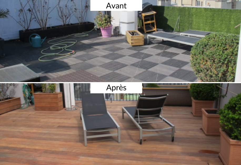Cette ancienne terrasse en caillebotis a été remplacé par des lames de bois en cumaru pour plus de stabilité et de beauté.