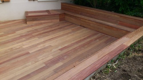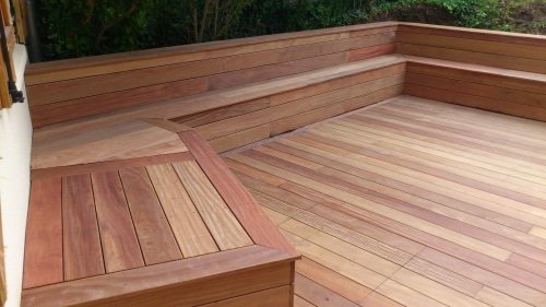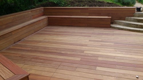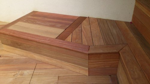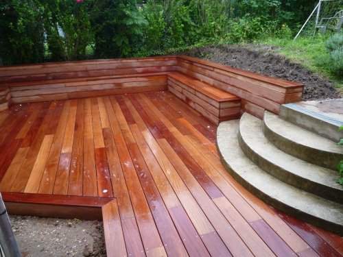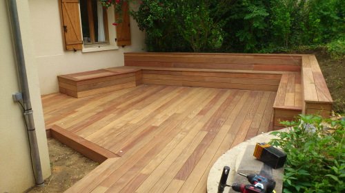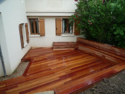 Terrasse en Cumaru, formes irrégulières avec un banc en bois exotique