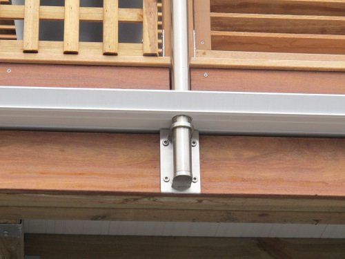Détail de montage de la gouttière avec les poteaux du garde-corps inox.