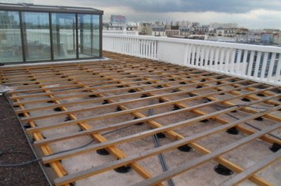 Double structure avec la bande bitumineuse posée sur plots sur étanchéité.