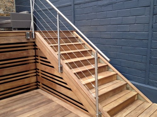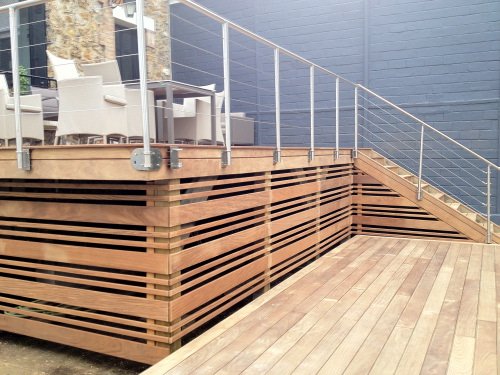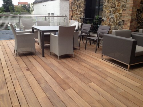 Une terrasse sur pilotis en Afrormosia et une terrasse sur terrain naturel sur vis de fondation