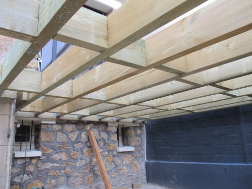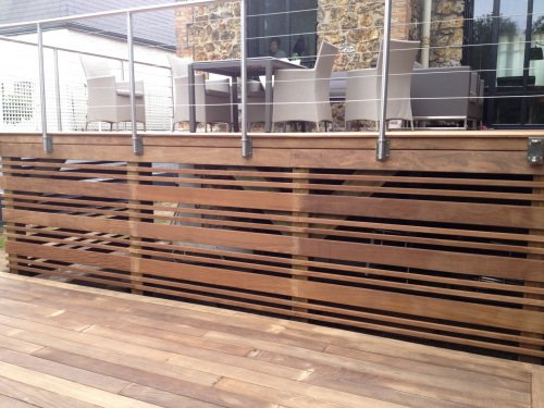 Terrasse en hauteur, sur pilotis avec vue d’ensemble du bardage en lames de terrasse.