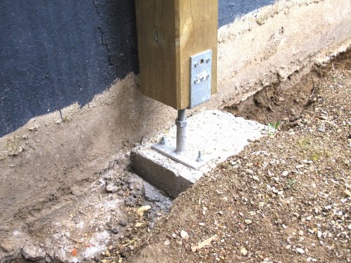 Les poteaux sont fixés sur des vis de fondation de 120 cm. Un des poteaux repose au bord d’un mur et la vis de fondation ne pouvait pas être implantée. Nous avons créé ici un plot en béton.