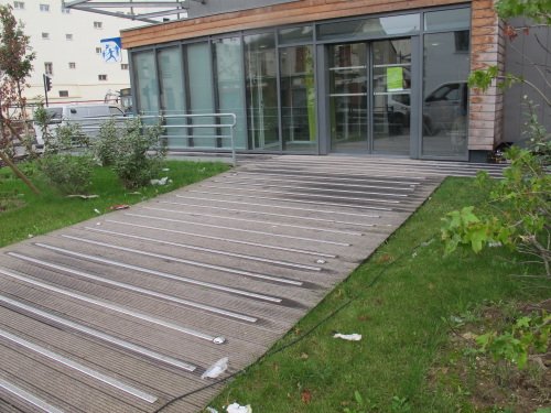 Les accès de la Sécurité Sociale ont été réalisés en bois exotique, comportant des rainures (peignes).