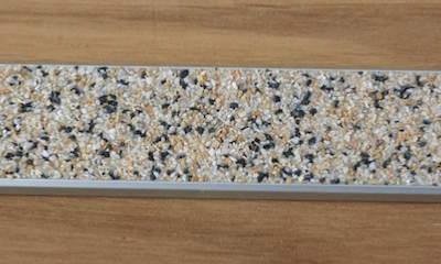 Nos bandes antidérapantes spécial terrasse bois sont constituées d’un profilés en aluminium anodisé, spécialement usiné pour recevoir l’antidérapant (granulat de marbre est mélangé à une résine).