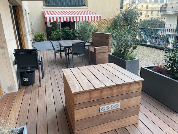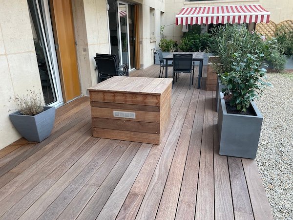 Nous avons également construit un cache en bois exotique, afin de camoufler une climatisation.