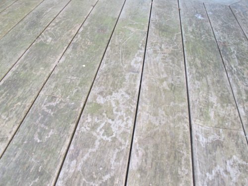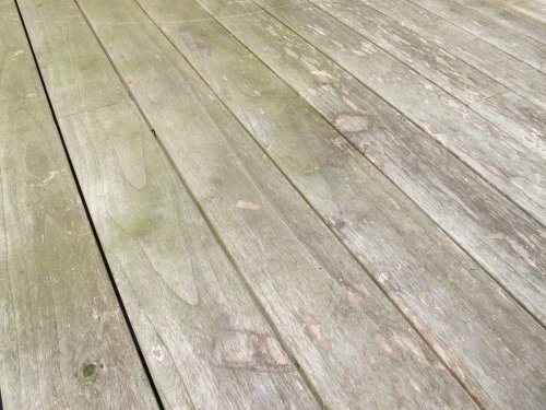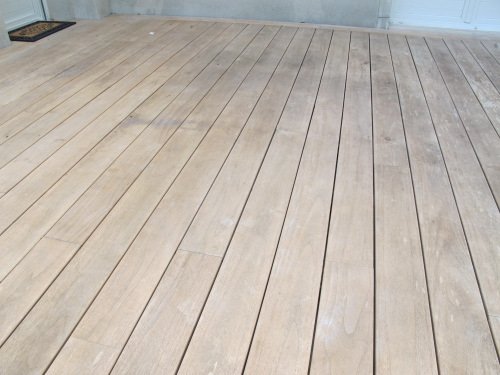 Cette terrasse en Teck, exposée plein nord était très grisée, avec des taches poches d’huile et un peu de moisissure en surface.