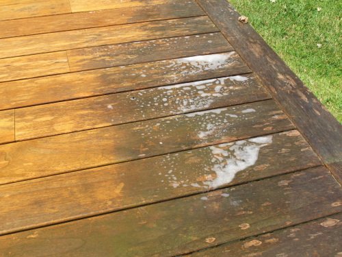 Première étape de rénovation de la terrasse en teck : nous humidifions la terrasse au jet d’eau, nous appliquons le dégriseur et frottons au balai brosse.