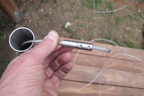 On passe le cable dans le poteau de départ et on le fait ressortir par en haut. On fixe deux serre-cables ce qui permet une fixation de départ du câble inox, invisible et économique.